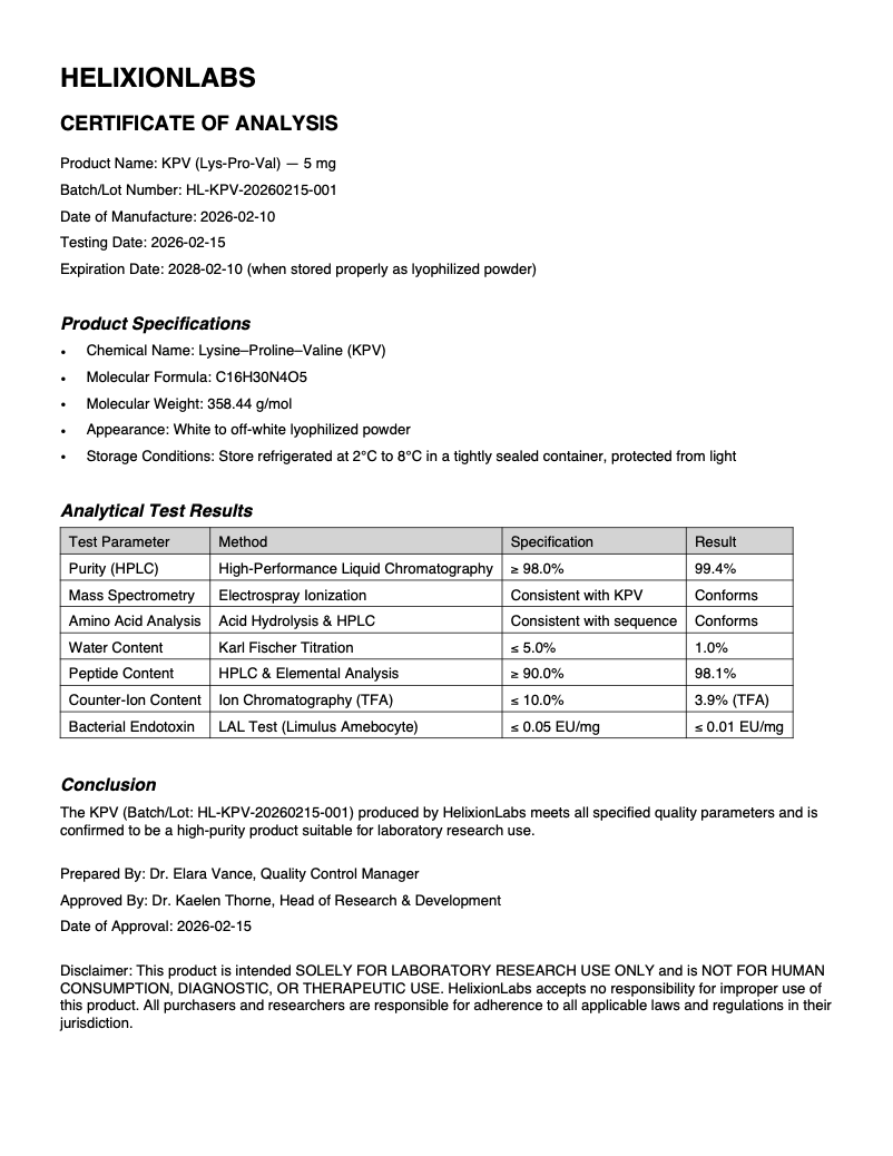 Helixion Labs supplies high-purity KPV (10mg) produced under strict manufacturing standards and verified through analytical testing to ensure consistency and reliability across research applications.